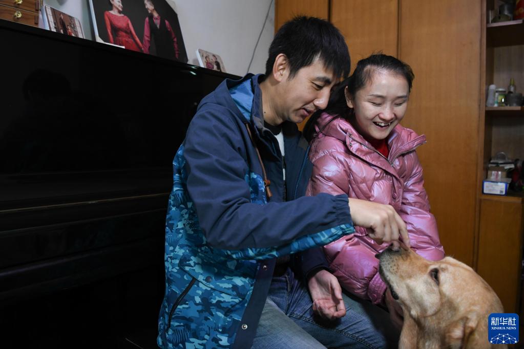 12月2日,在位于安慶市的家中,唐聞澤、張晨和領(lǐng)養的導盲犬在一起。