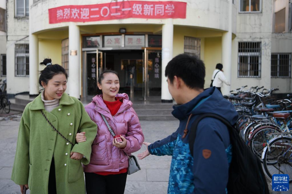 12月2日,在安慶師范大學(xué),唐聞澤(右)在女生公寓門(mén)口接張晨(中)去吃早餐。