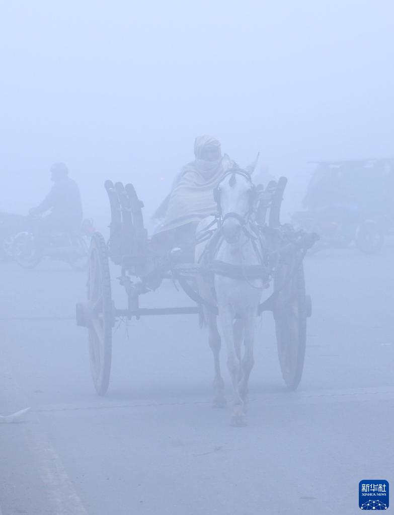 12月15日,一名男子駕馬車(chē)在大霧彌漫的巴基斯坦拉合爾街頭行進(jìn)。