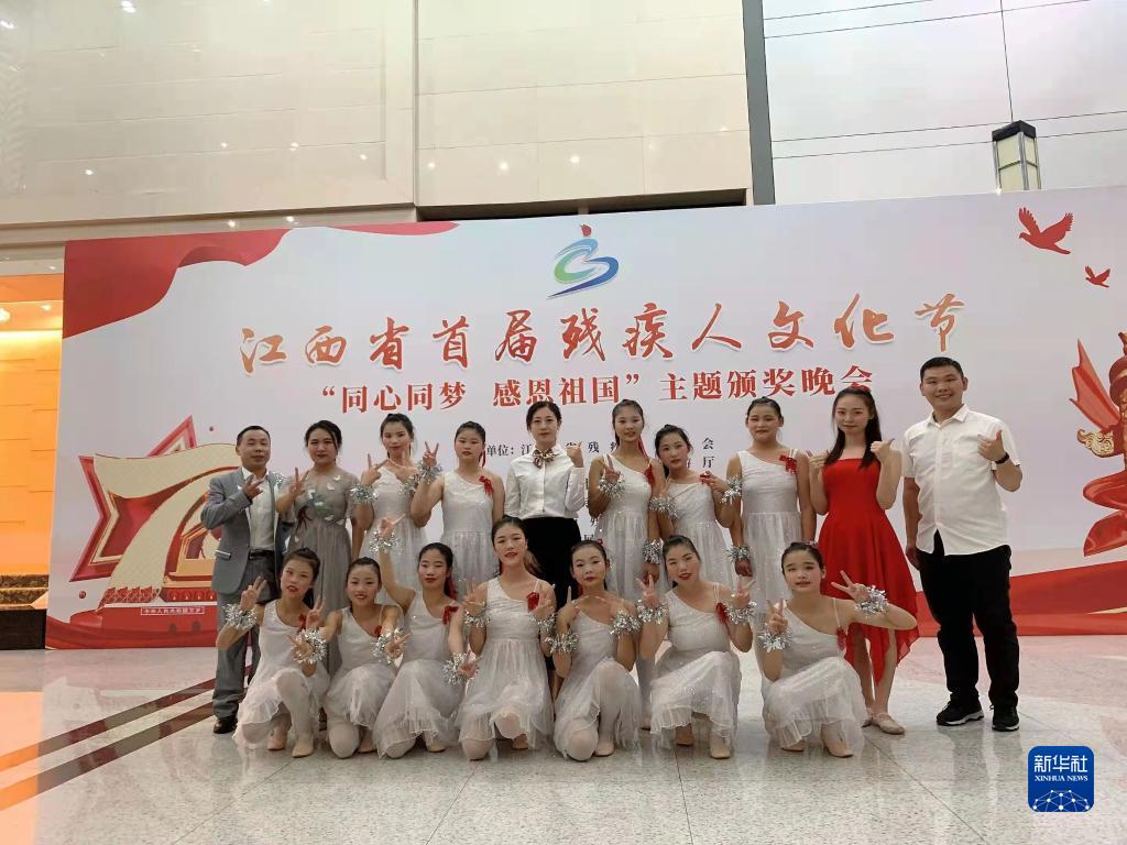 2019年江西省首屆殘疾人文化節演出現場(chǎng),樊海艷帶著(zhù)參加舞蹈演出的學(xué)生們一起合影(資料照片)。