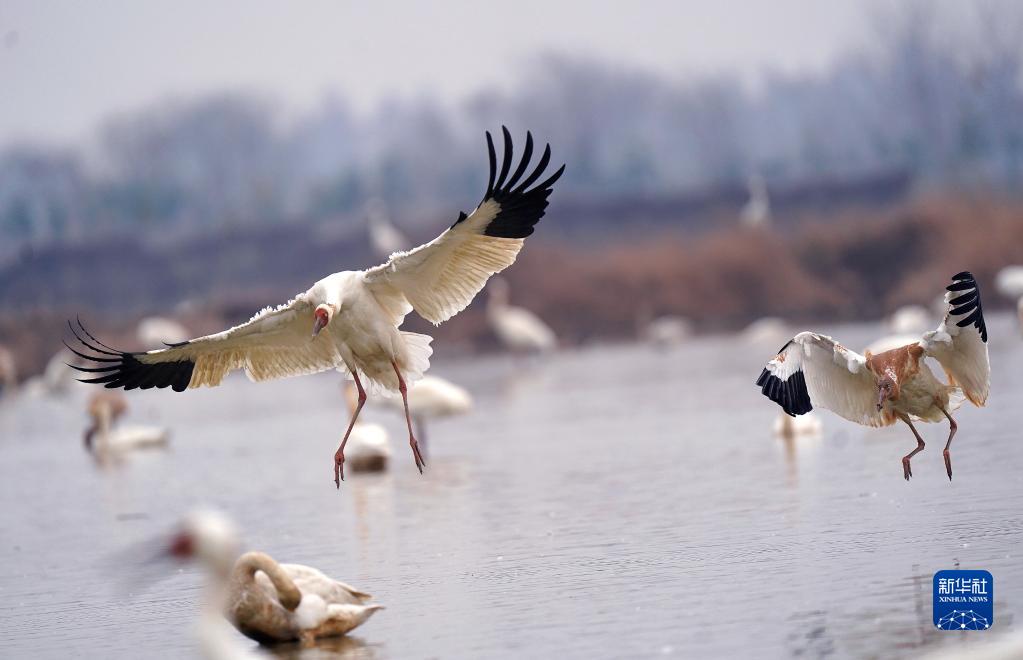 白鶴在濕地飛舞(1月1日攝)。新華社記者 萬(wàn)象 攝
