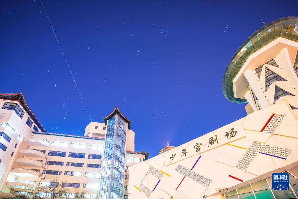 2021年12月16日在北京市東城區少年宮拍攝的中國空間站過(guò)境照片(軌跡為多張照片堆棧)。