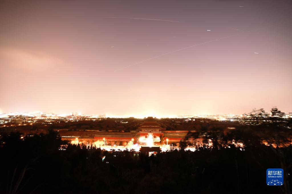 2021年12月21日拍攝的中國空間站從北京故宮上空飛過(guò)的照片(下面的線(xiàn)為中國空間站,軌跡為多張照片堆棧)。