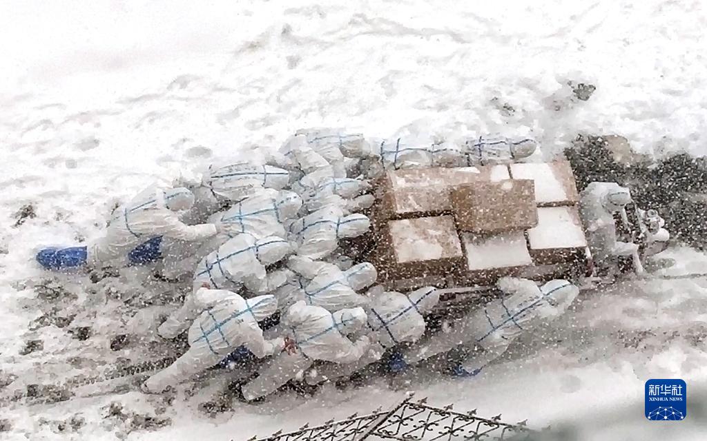 2021年1月6日,在為應對新冠肺炎疫情而封閉的大連海洋大學(xué)校園內,志愿者推著(zhù)滿(mǎn)載的三輪車(chē)上坡,將物資送往學(xué)生宿舍。