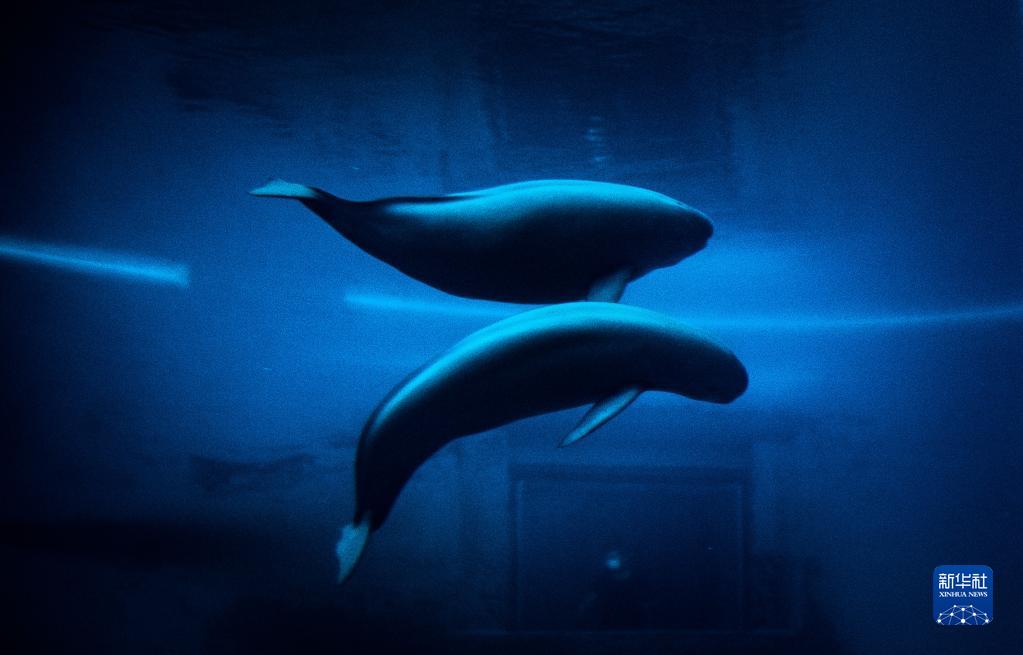 2021年7月5日,在中國科學(xué)院水生生物研究所白鱀豚館里,一對江豚母子在水中游弋。