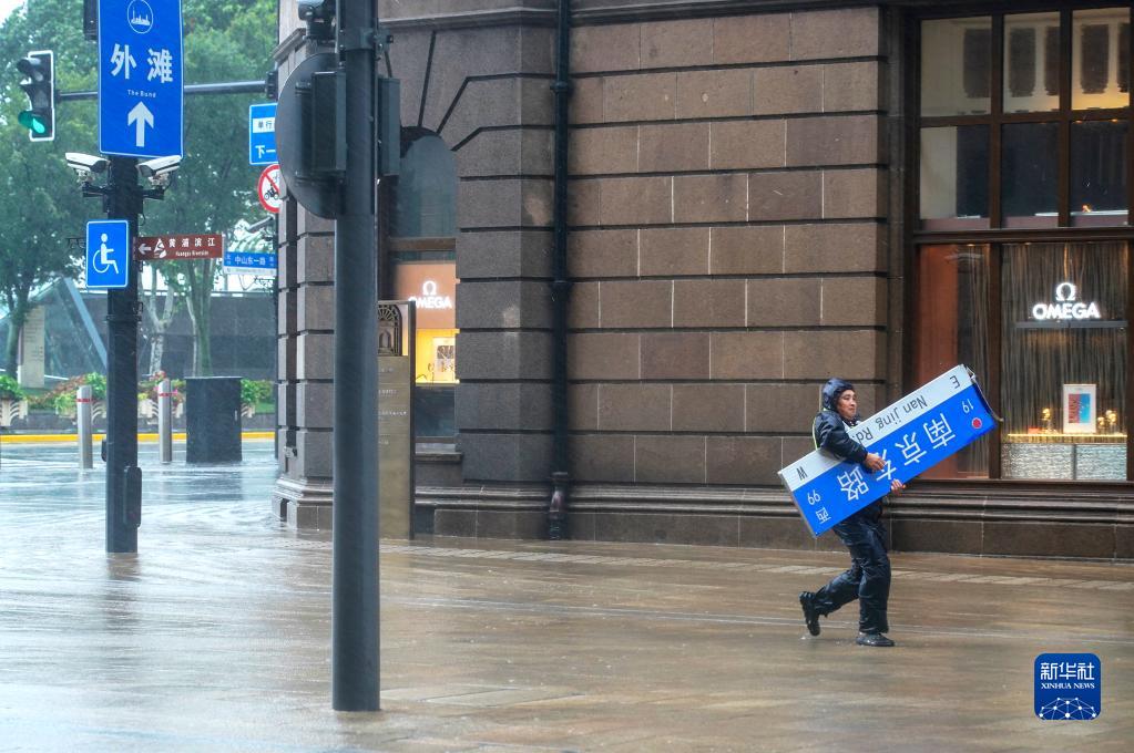 2021年7月25日,工作人員在上海街頭搬運因臺風(fēng)“煙花”被吹落的路牌。