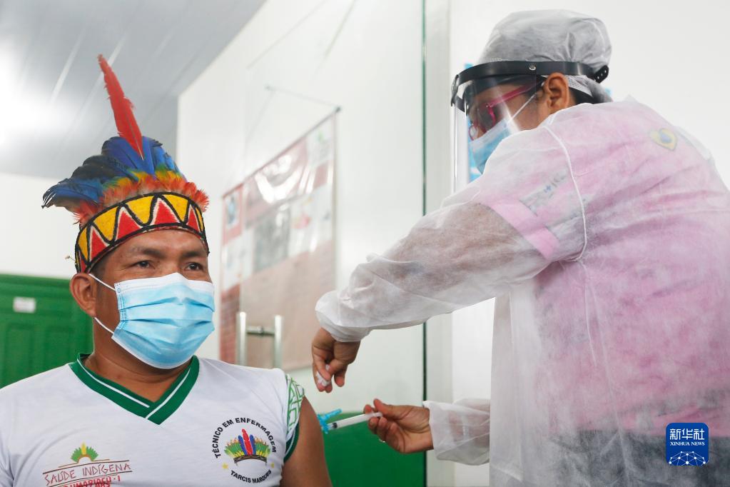 2021年1月19日,在巴西亞馬孫州塔巴廷加市,醫務(wù)人員為一名原住民接種中國新冠疫苗。