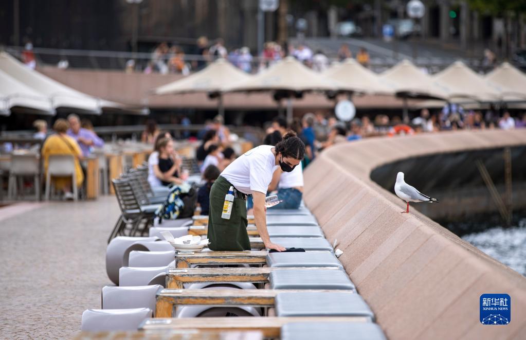 1月9日,一名餐廳服務(wù)員在澳大利亞悉尼清潔戶(hù)外餐桌椅。