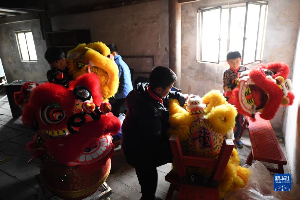 1月21日,在前童古鎮祠堂,舞獅隊成員搬運獅頭準備訓練。