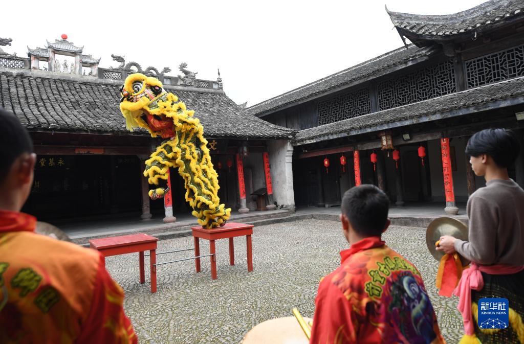 1月21日,在前童古鎮祠堂,古鎮舞獅隊在訓練。