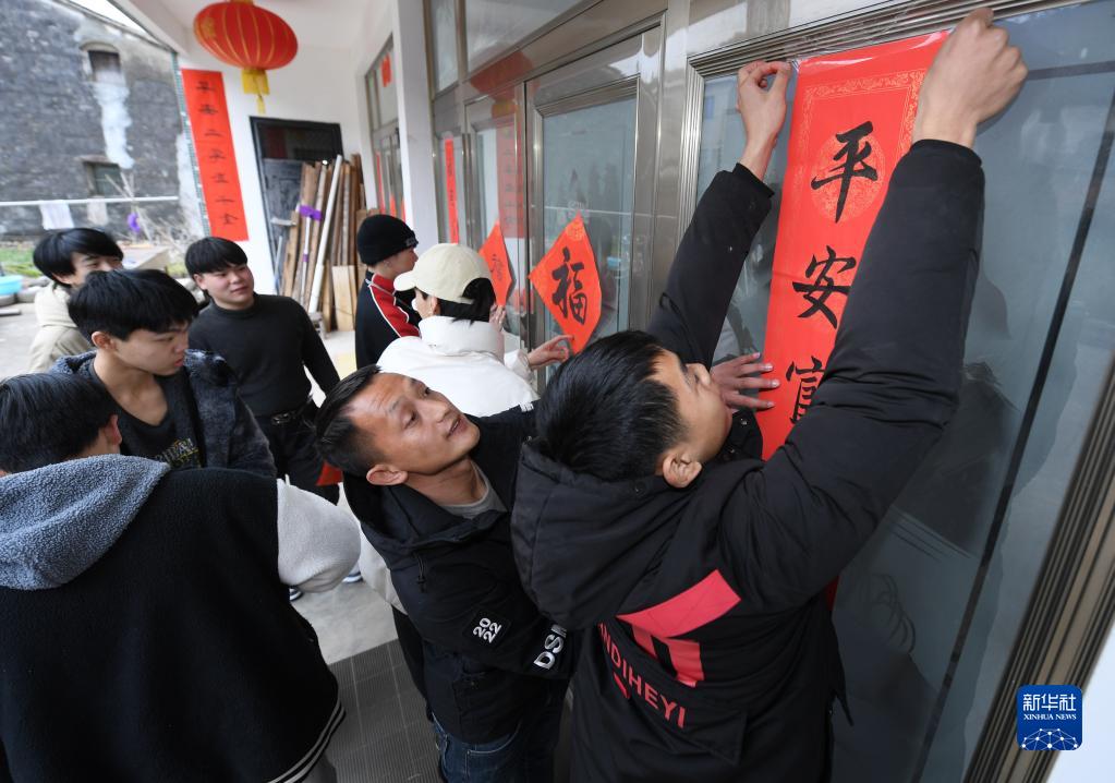 1月21日,在前童鎮橋頭楊村,舞獅隊成員在童攀峰家中幫老師貼春聯(lián)。