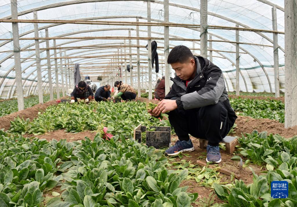 1月31日,在河北省邢臺市南和區賈宋鎮郄村,宋建飛在蔬菜大棚內采收菠菜。
