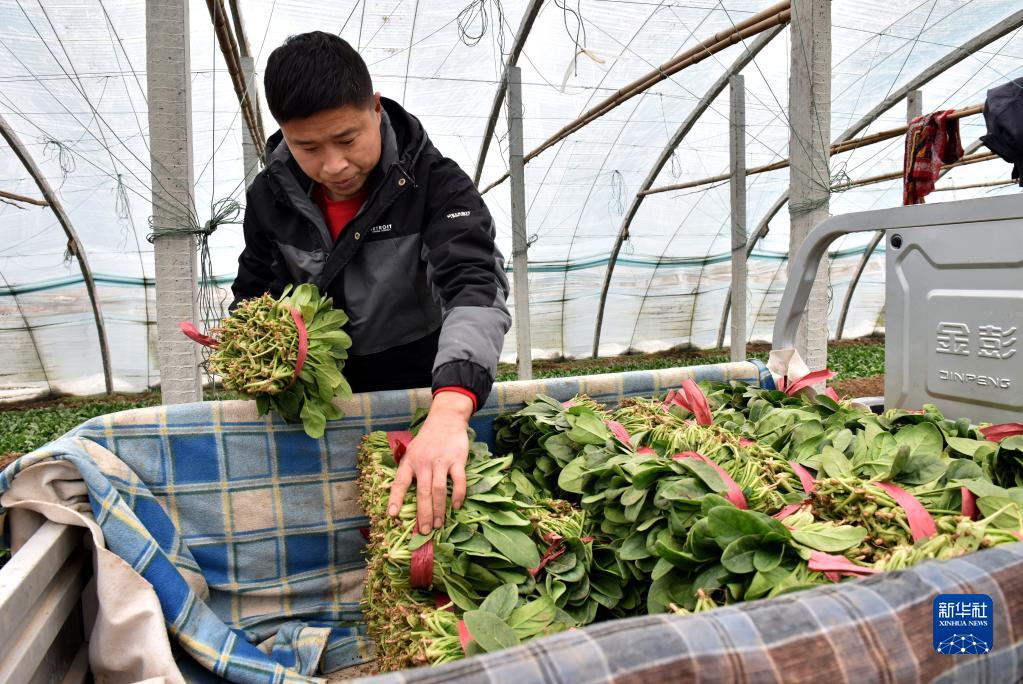 1月31日,在河北省邢臺市南和區賈宋鎮郄村,宋建飛把采收的菠菜裝車(chē)。