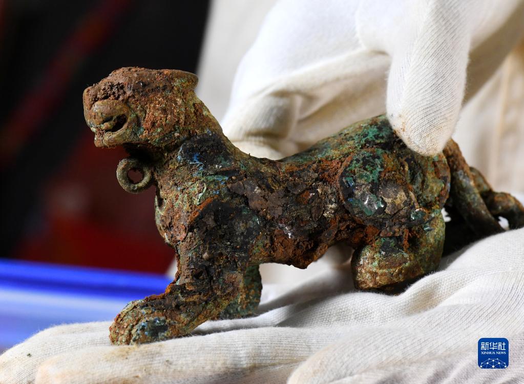 2018年初,隨著(zhù)對江西南昌?;韬钪觿⒊鋰讟〉膶?shí)驗室考古發(fā)掘結束,這件2000多年前的青銅小虎得以重見(jiàn)天日(2018年1月29日攝)。這只惟妙惟肖的青銅小虎足部有四個(gè)可以轉動(dòng)的滾輪,頸部還有一圓環(huán)??脊艑W(xué)家推測,這極有可能是劉充國兒時(shí)的玩具。