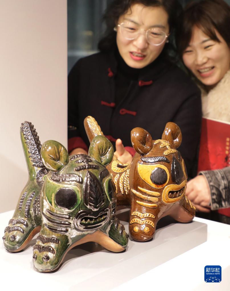 1月19日,在江蘇省宜興市丁蜀鎮,市民在觀(guān)賞以民間傳統虎頭鞋為藍本創(chuàng )作的陶瓷《神威虎》。