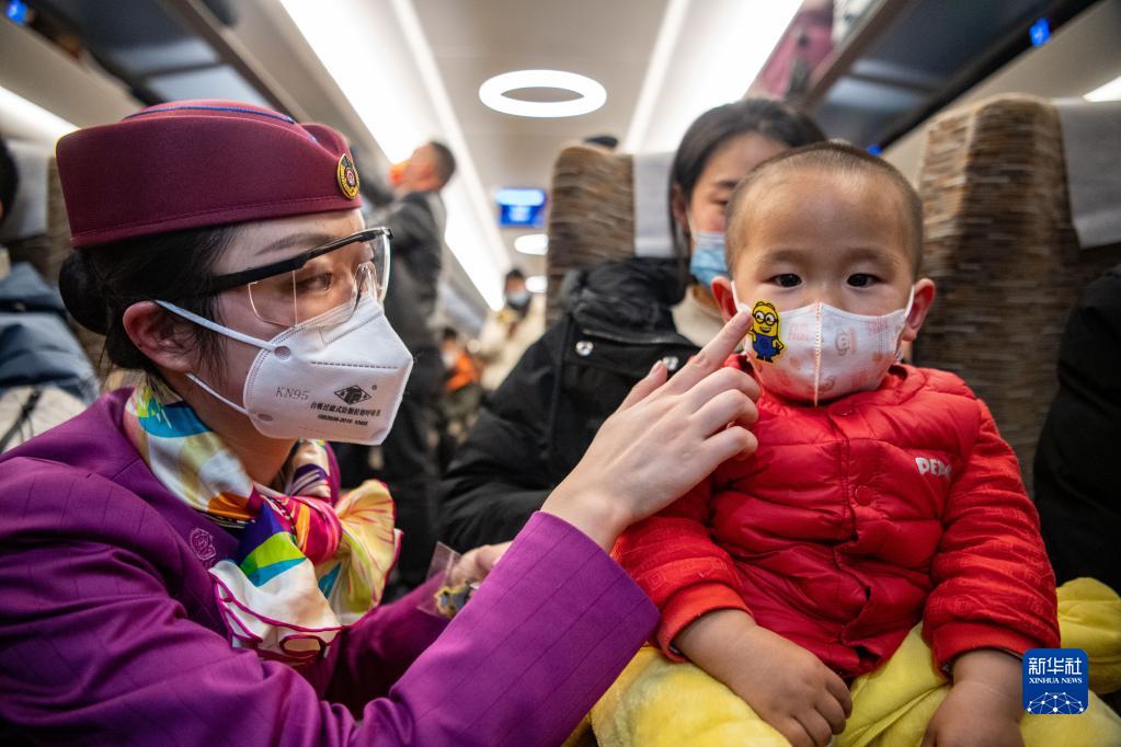 林夢(mèng)凡(左)在成渝高鐵智能復興號“共青團號”列車(chē)上給小朋友的口罩貼上卡通貼紙(1月27日攝)。