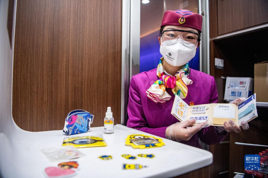 林夢(mèng)凡在成渝高鐵智能復興號“共青團號”列車(chē)上展示““哆啦A夢(mèng)口袋”里的小物件(1月27日攝)。