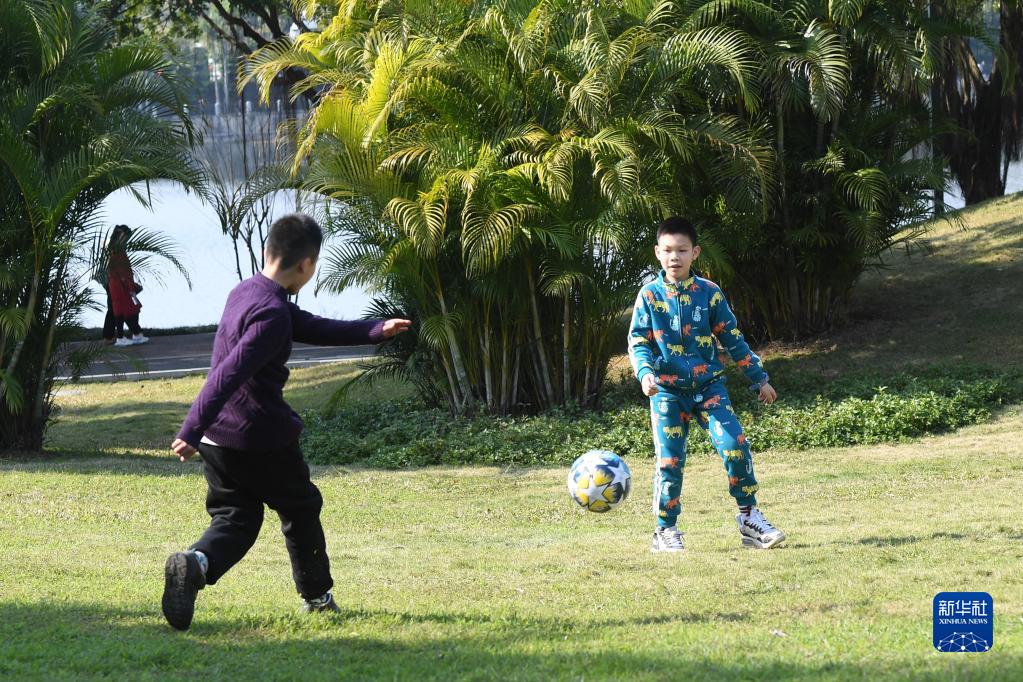 2月4日,小朋友在廣西南寧市南湖邊的草地上玩耍。