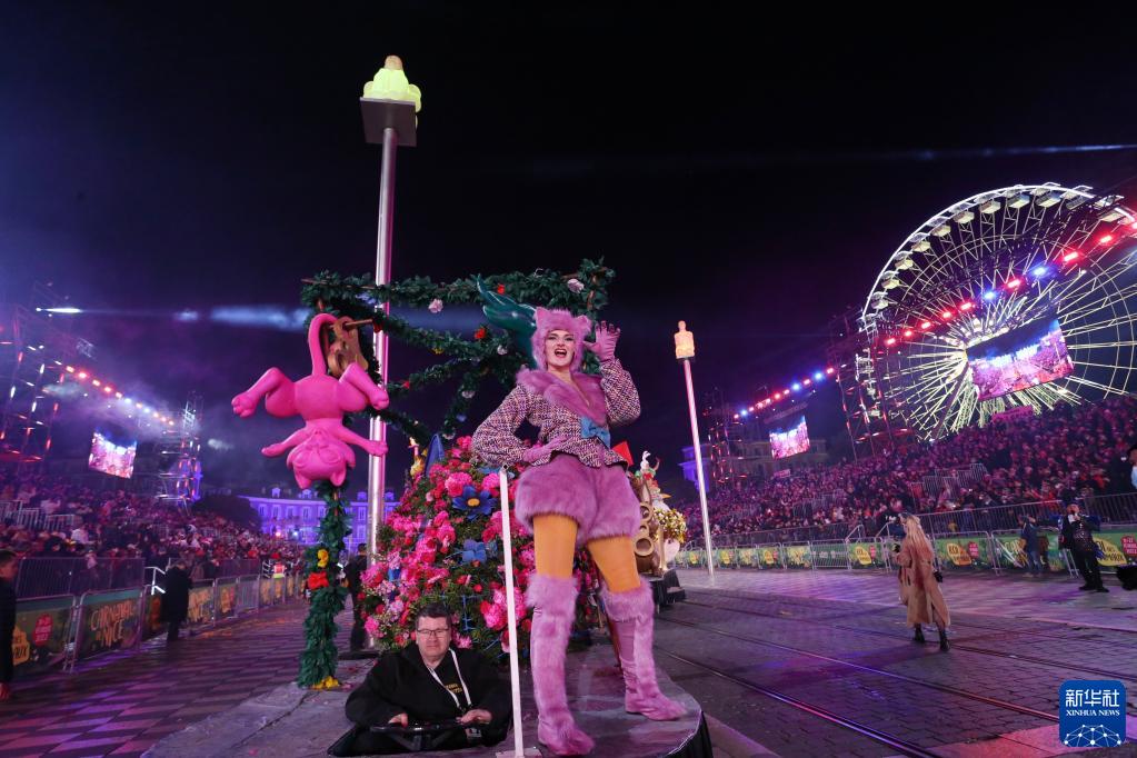 這是2月12日在法國南部城市尼斯拍攝的狂歡節花車(chē)夜間游行現場(chǎng)。