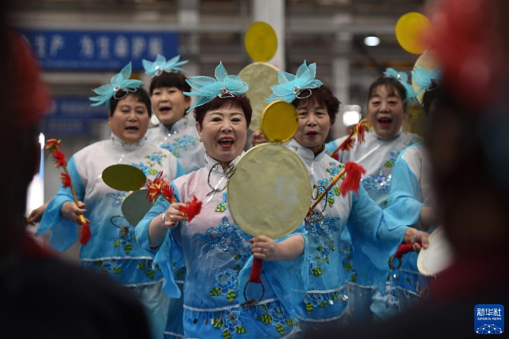 2月13日,在河北電機股份有限公司生產(chǎn)車(chē)間,石家莊市欒城區樓底農民工俱樂(lè )部成員在現場(chǎng)演出節目。