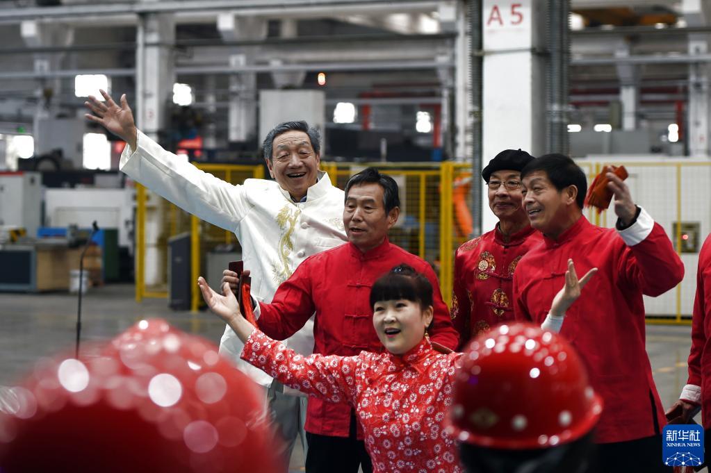 2月13日,在河北電機股份有限公司生產(chǎn)車(chē)間,李俊岐(左一)與石家莊市欒城區樓底農民工俱樂(lè )部成員在現場(chǎng)演出節目。