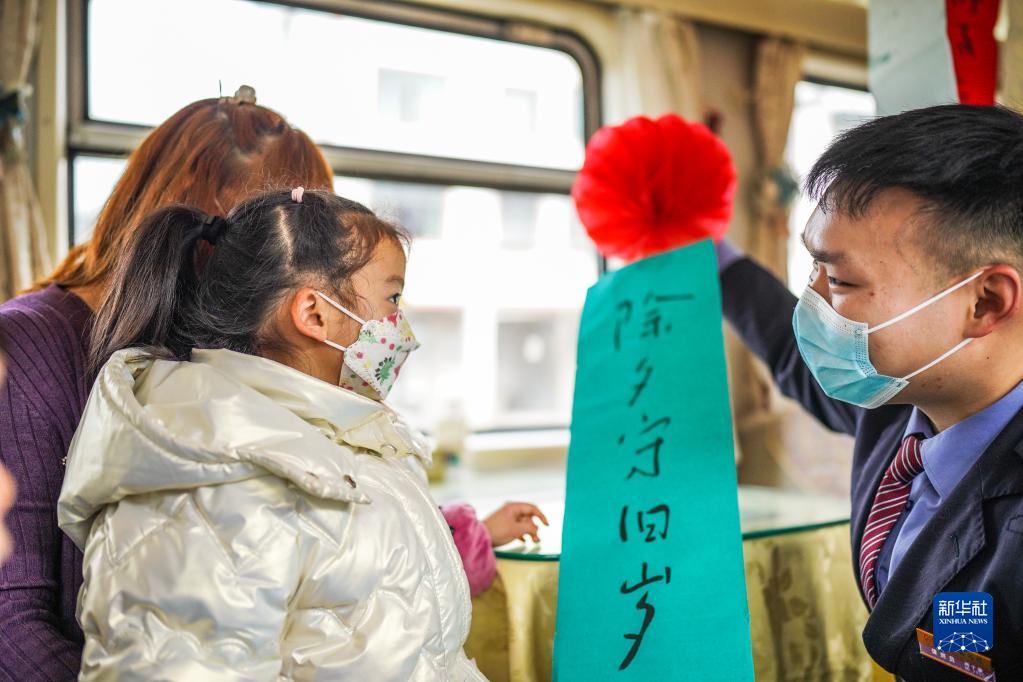 2月15日,在貴陽(yáng)開(kāi)往上海南的K112次列車(chē)上,貴陽(yáng)客運段乘務(wù)員和小朋友一起猜燈謎。