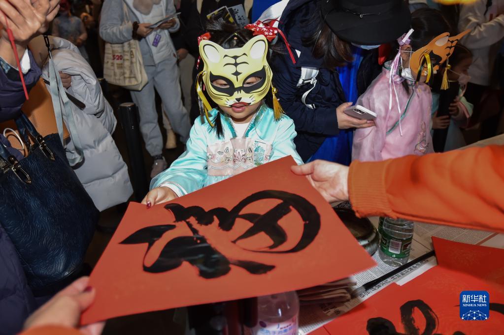 2月15日,在清華大學(xué)藝術(shù)博物館元宵節夜場(chǎng)活動(dòng)上,佩戴虎頭面具的小朋友領(lǐng)取現場(chǎng)書(shū)寫(xiě)的“?!弊?。