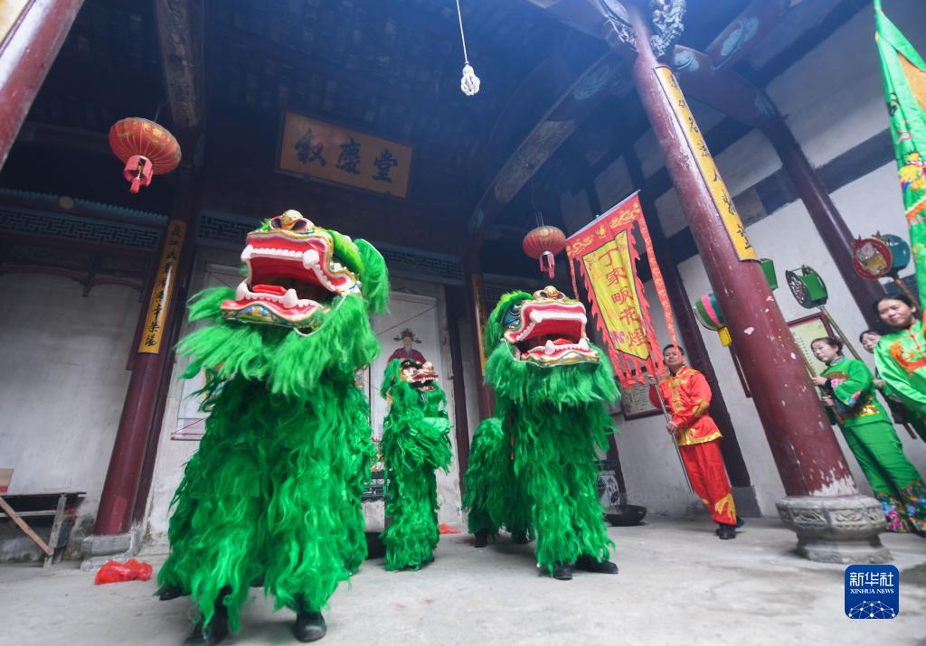 2月15日,綠獅花燈隊在浙江省杭州市淳安縣屏門(mén)鄉齊坑村老祠堂表演。在齊坑村舉行的鬧元宵活動(dòng)上,杭州市級非遺項目“齊坑綠獅”和花燈環(huán)游等表演讓游客和村民感受傳統文化的魅力。