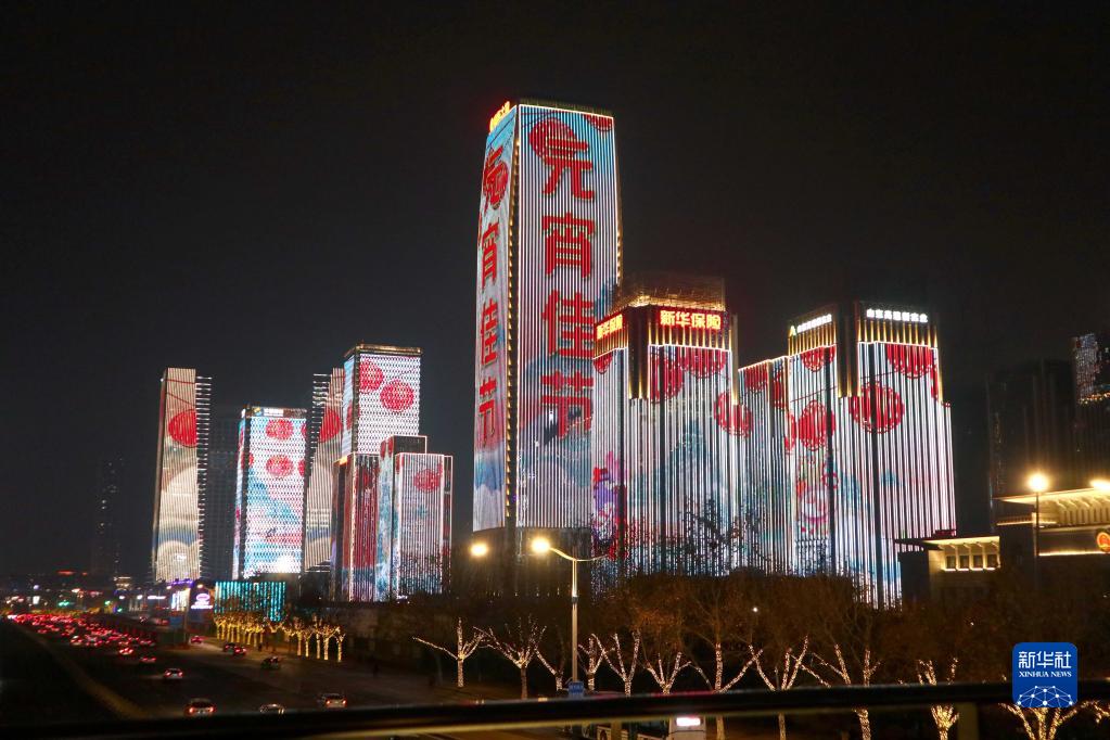 2月15日,山東省濟南市的建筑群亮燈慶賀元宵佳節。