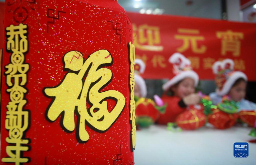 2月14日,在江蘇省揚州市邗江區竹西街道安平社區,小朋友們在制作花燈。