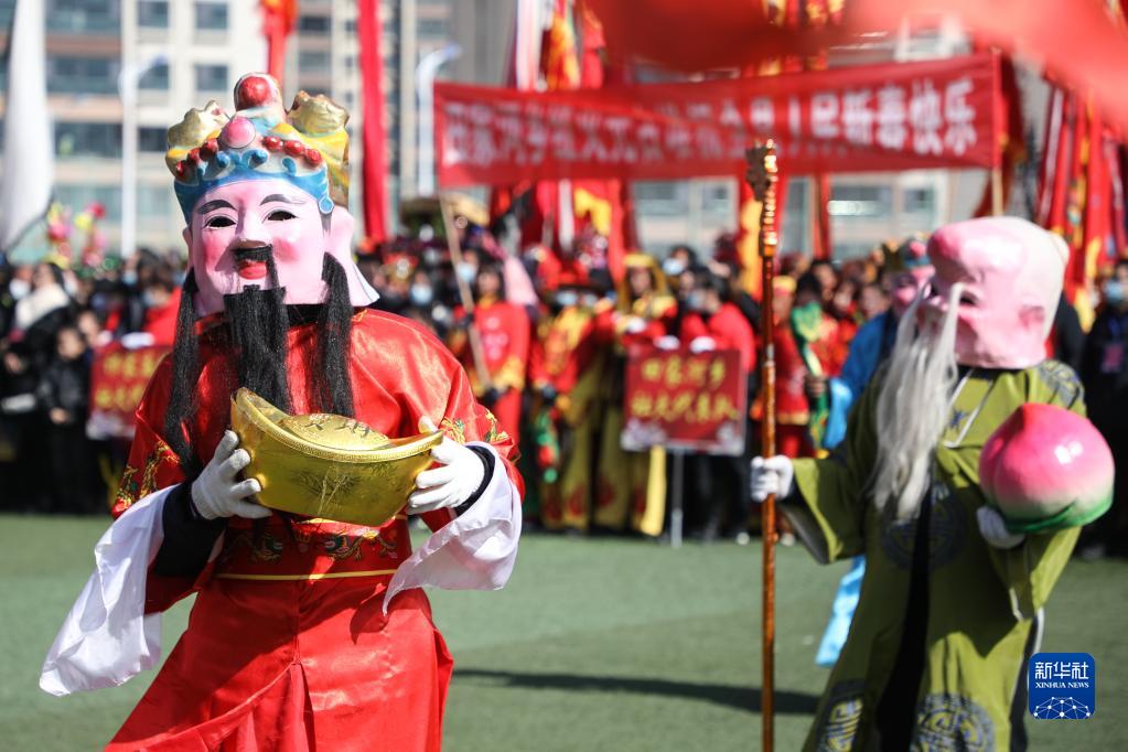 2月15日,甘肅省定西市渭源縣的農村社火隊在表演。
