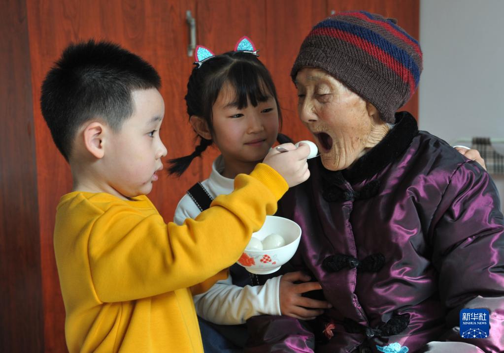 2月15日,河北省石家莊市藁城區系井村五世同堂的百歲老人周香榮品嘗玄孫遞上的元宵。