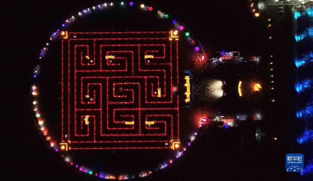 2月14日拍攝的寧夏鹽池縣黃河九曲龍門(mén)燈陣(無(wú)人機照片)。元宵節期間,寧夏鹽池縣開(kāi)展龍門(mén)祈福游九曲系列元宵節民俗文化活動(dòng),吸引眾多百姓前來(lái)參觀(guān)體驗。