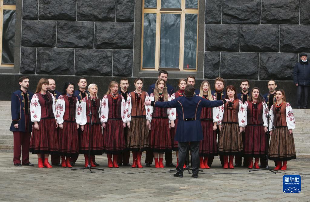 2月16日,在烏克蘭首都基輔,身著(zhù)烏克蘭傳統服飾的合唱團演員唱國歌。