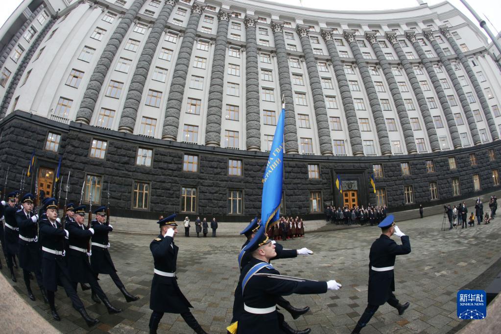 2月16日,在烏克蘭首都基輔,烏國民衛隊儀仗隊行進(jìn)至烏克蘭政府辦公大樓。