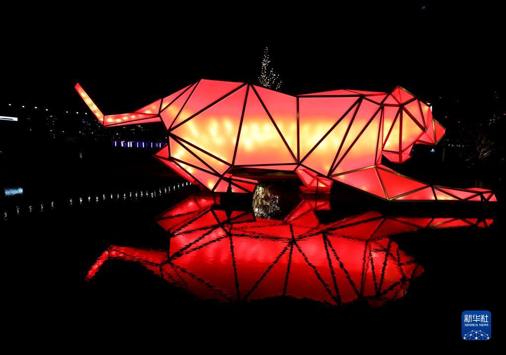 2月17日,在英國倫敦,慶祝中國虎年的燈光藝術(shù)裝置在巴特西發(fā)電站燈光節上展出。