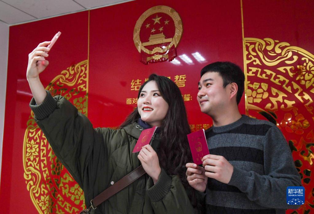 2月22日,新人在內蒙古呼和浩特市回民區市民服務(wù)中心內合影留念。