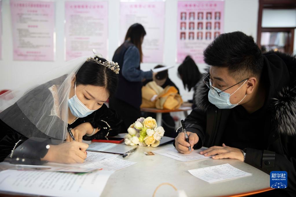 2月22日,在哈爾濱市道里區民政局婚姻登記處,新人在登記結婚。