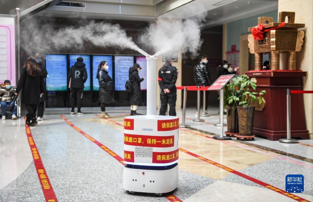 2月23日,在呼和浩特市婦幼保健院門(mén)診樓內,消毒機器人正在工作。