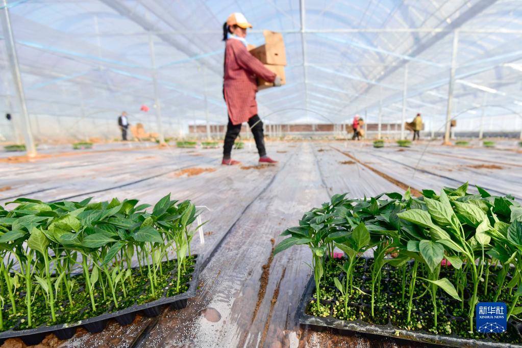 2月23日,工作人員在山東省青州市益都街道一處蔬菜育種實(shí)驗田搬運辣椒苗。