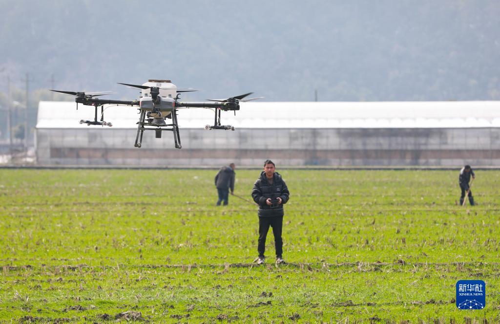 2月23日,在浙江省杭州市臨安區天目山鎮“天目糧倉”基地,種植戶(hù)操作無(wú)人機對小麥進(jìn)行施肥作業(yè)。