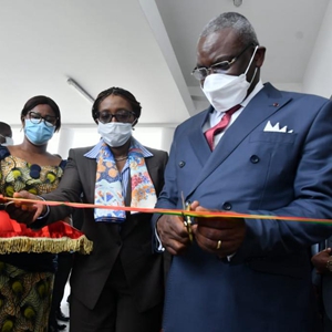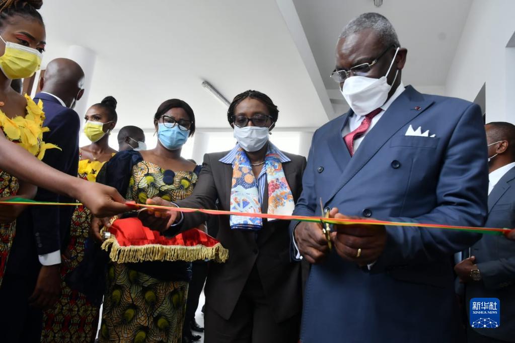 2月24日,剛果(布)總理馬科索(右)在布拉柴維爾為人工智能研究中心剪彩。
