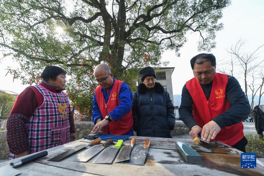 3月1日,昌化鎮“有禮昌化”流動(dòng)志愿服務(wù)站的志愿者在給白牛村的村民們提供磨刀剪服務(wù)。
