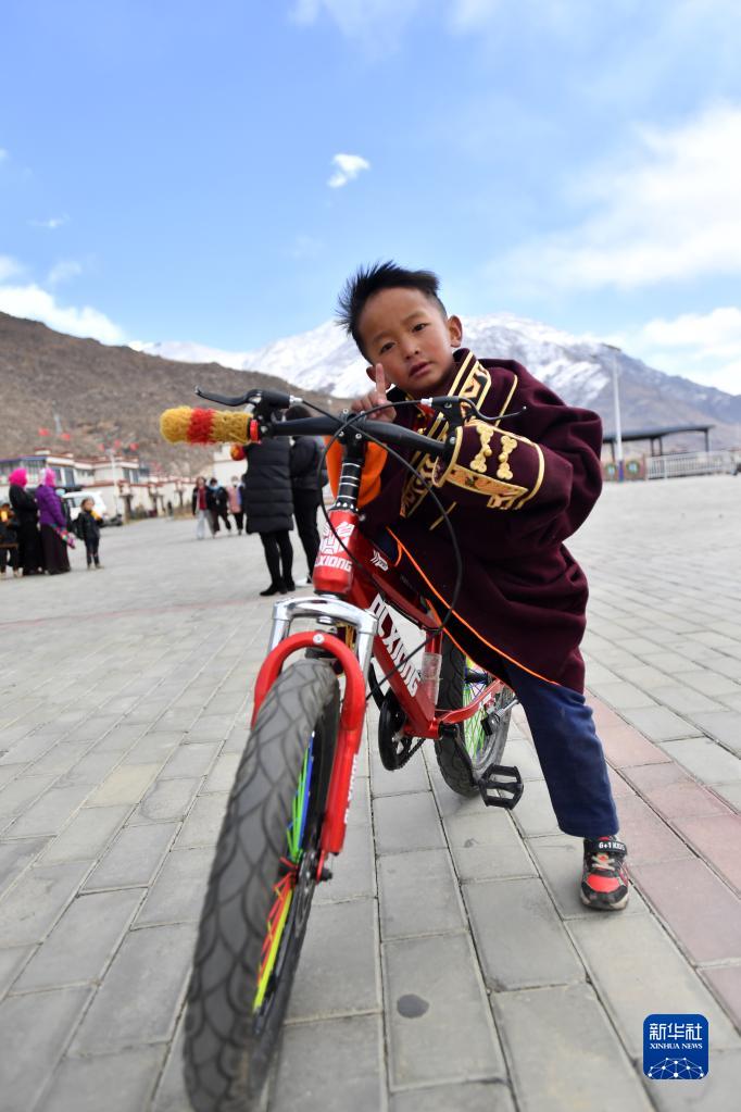 一位搬遷牧民家的孩子在榮瑪高海拔生態(tài)搬遷點(diǎn)騎自行車(chē)玩耍(2月28日攝)。