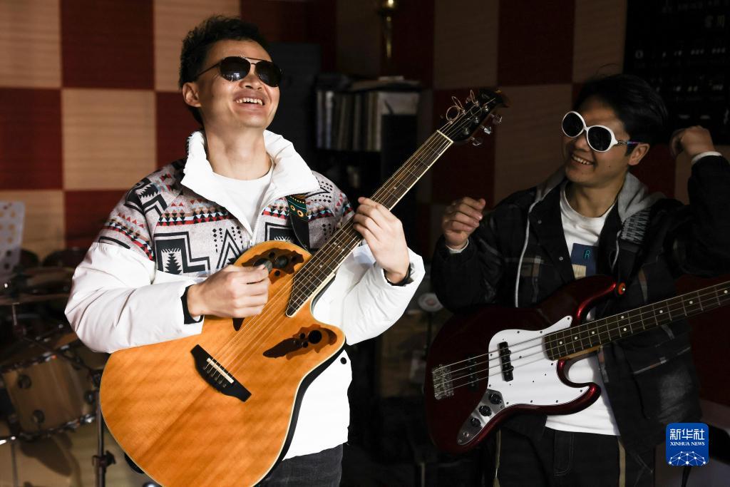 3月1日,“折耳根”樂(lè )隊吉他手楊志(左)與貝斯手彭萬(wàn)海在琴行內排練。