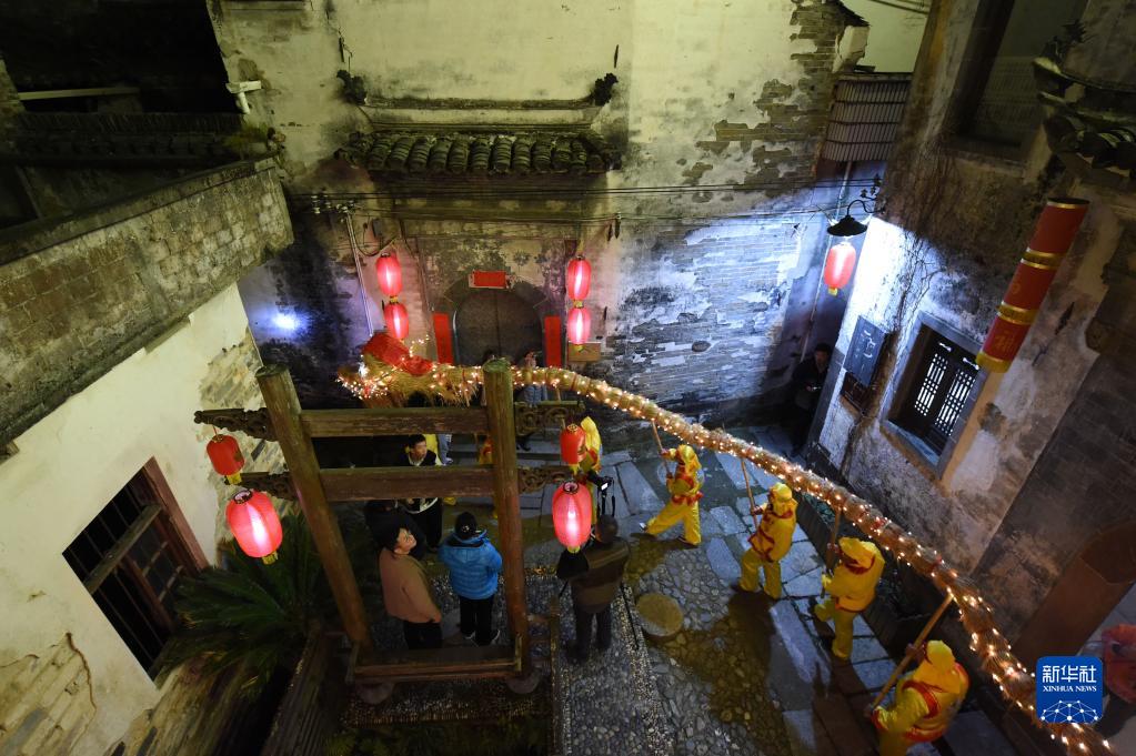3月2日,在黃山市徽州區蜀源村,“舞草龍”隊伍在村中巡游。