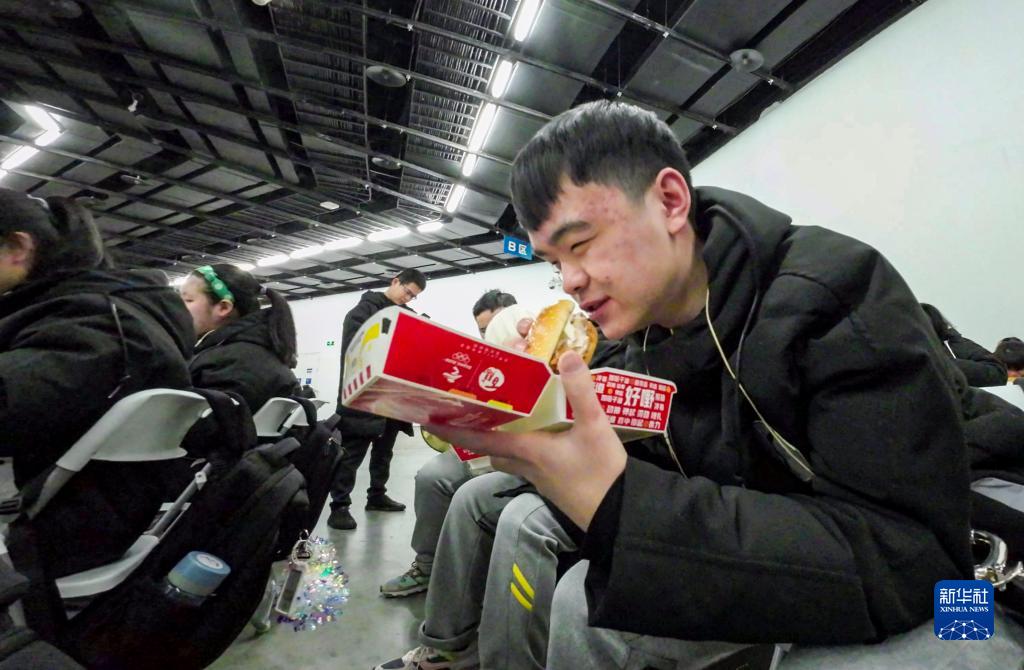 圖為在北京國家體育場(chǎng)“鳥(niǎo)巢”進(jìn)行彩排時(shí),重慶市特殊教育中心揚帆管樂(lè )團小號手王太樊在休息區吃飯(3月3日攝)。