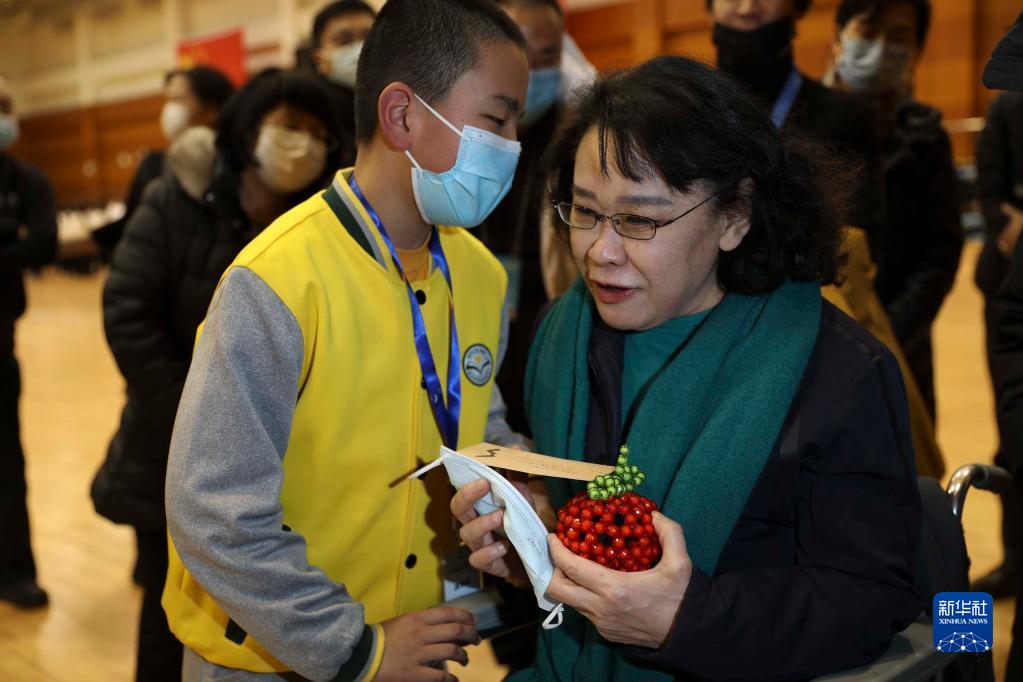 圖為在中國殘疾人體育運動(dòng)管理中心的排練場(chǎng)館,中國殘聯(lián)主席、北京冬奧組委執行主席張海迪(右)和揚帆管樂(lè )團的一名小樂(lè )手交流(2月11日攝)。