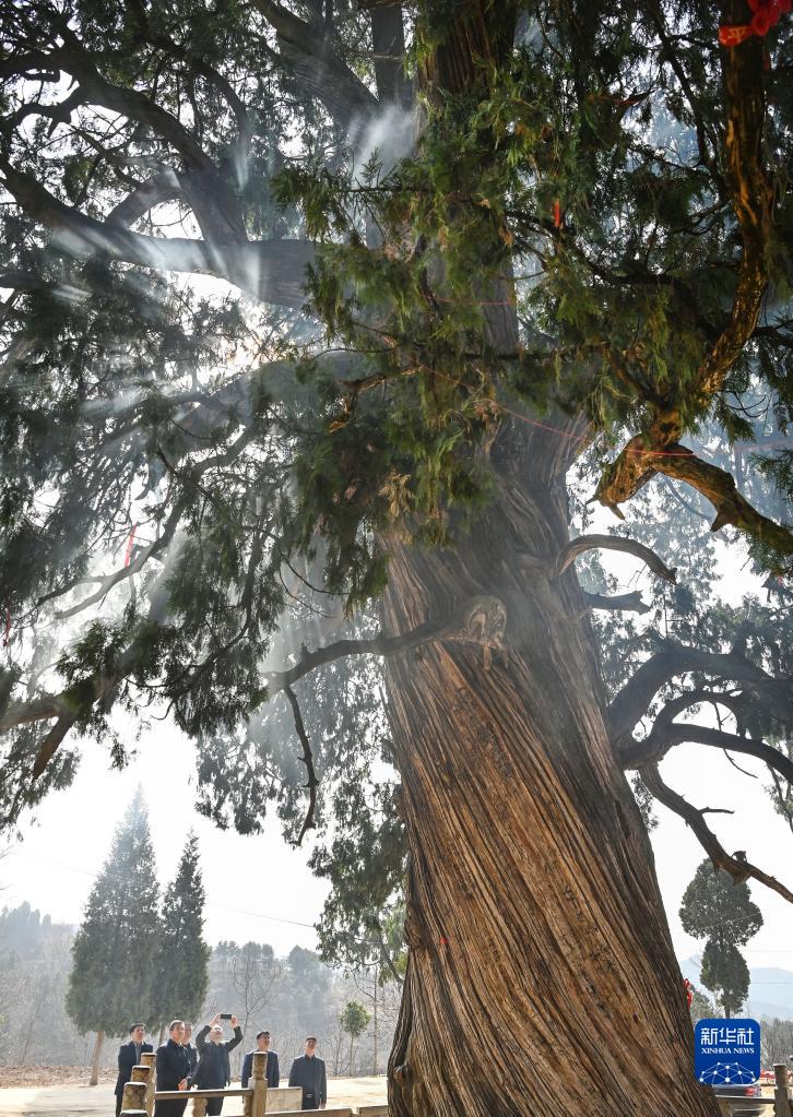 3月11日,游人在洛南縣古城鎮南村參觀(guān)古柏。