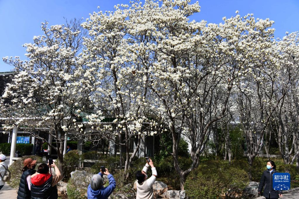 3月14日,游客在山東省濟南市百花公園拍攝盛開(kāi)的玉蘭花。